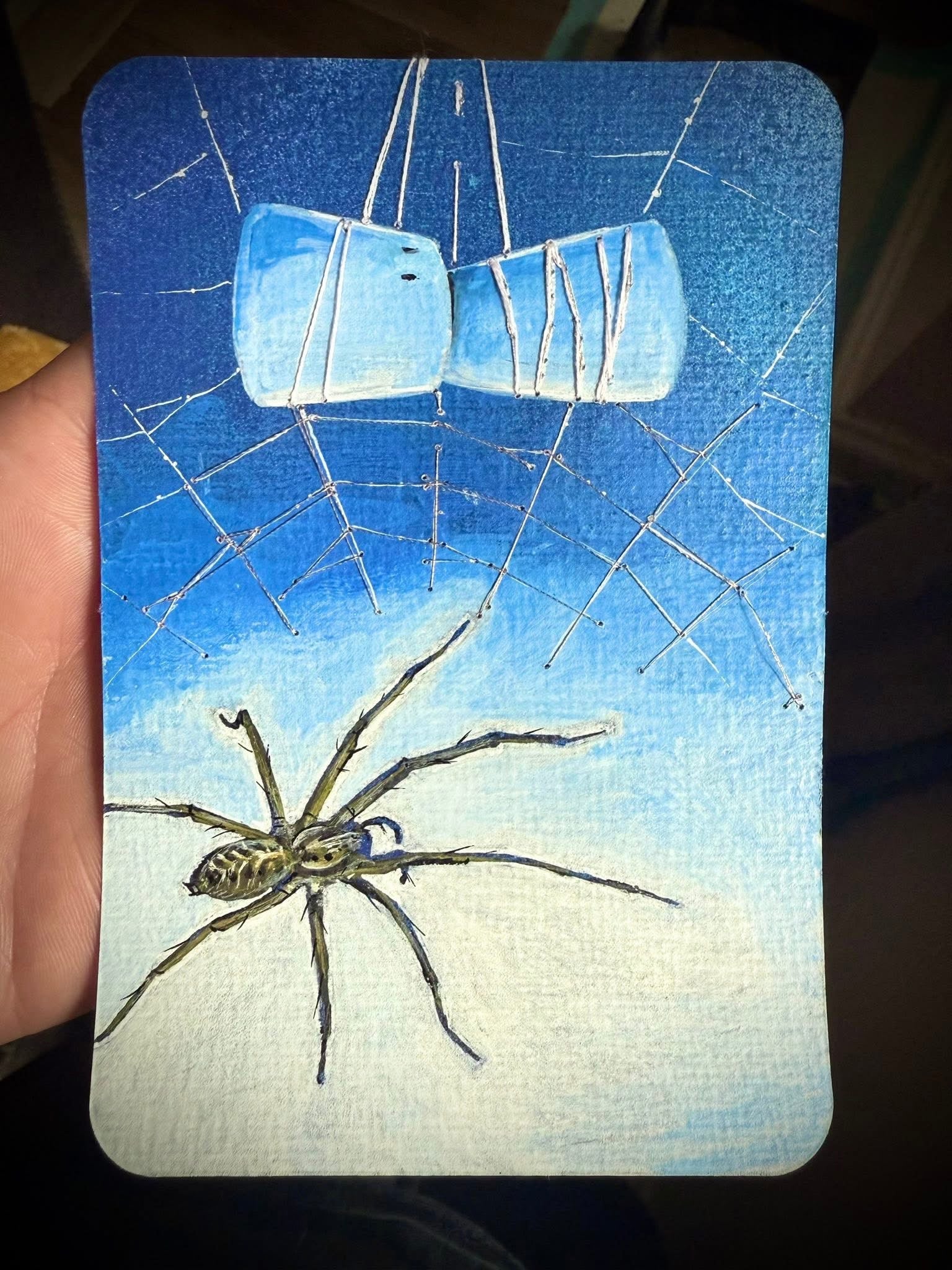 Ink, spray paint, thread and acrylic on artist quality blank postcard